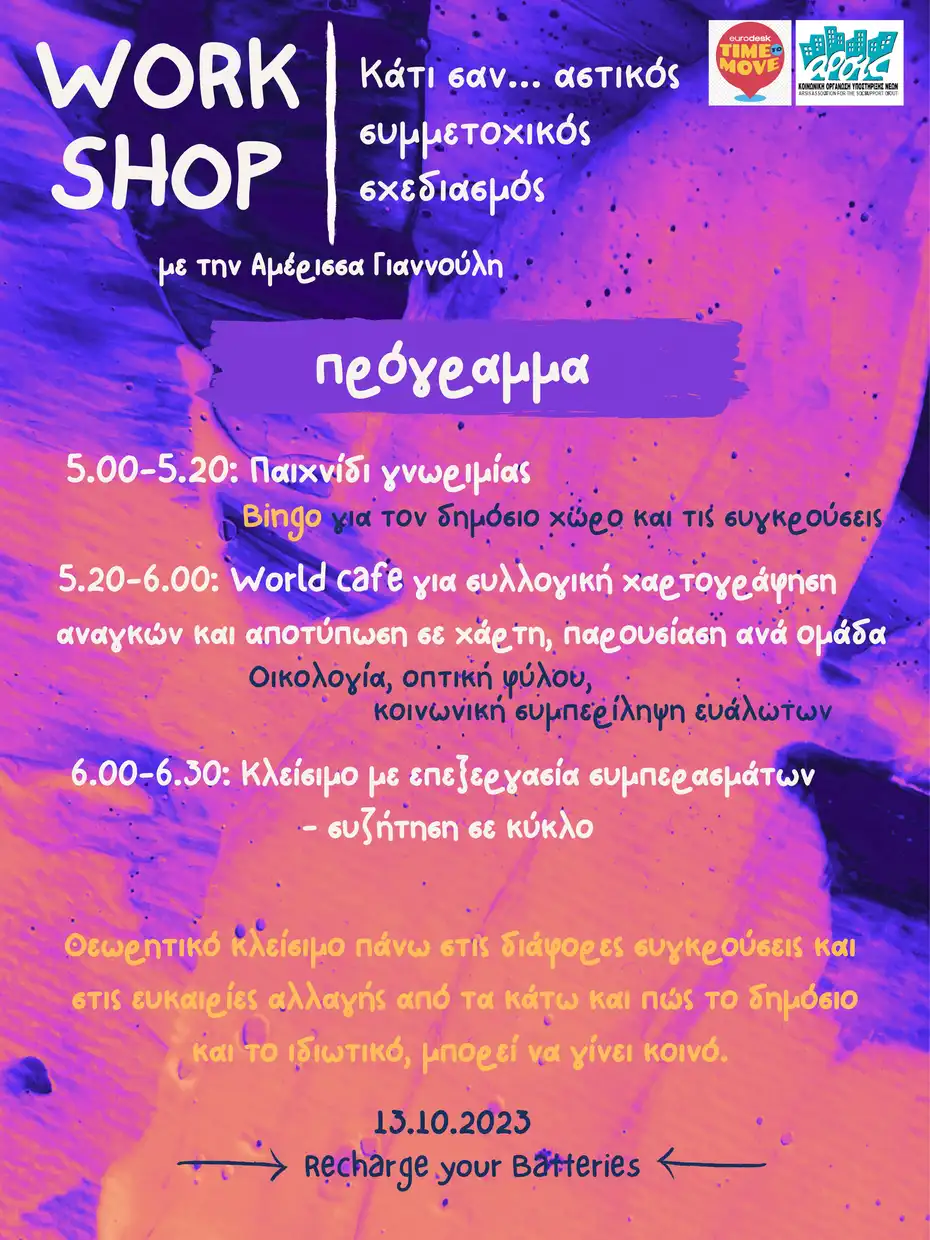 Σας καλούμε να δηλώσετε συμμετοχή στο διαδραστικό εργαστήριο «Κάτι σαν αστικός συμμετοχικός σχεδιασμός», που θα υλοποιηθεί την Παρασκευή 13 Οκτωβρίου, στις 17:00, στην πλατεία της Σκρ’κας, στο πλαίσιο του φεστιβάλ «Recharge your Batteries» που διοργανώνει η ομάδα Street Art in the Neighborhoods, της ΑΡΣΙΣ Κοζάνης, στο πλαίσιο της καμπάνιας Time to Move.