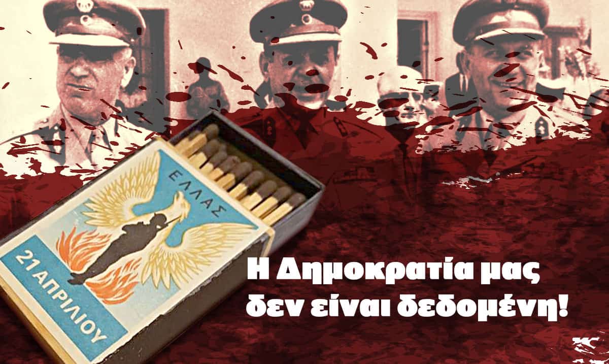 Την 21η Απριλίου 1967 ξεκίνησε η πιο πρόσφατη περίοδος ανελευθερίας κι αυταρχικής επιβολής στην ιστορία του ελληνικού κράτους. Επιχειρήθηκε η ακύρωση της Δημοκρατίας με πρόσχημα τον κίνδυνο που διέτρεχε «το έθνος κι η πατρίδα», για να καταλήξει στον ακρωτηριασμό της Κυπριακής Δημοκρατίας.