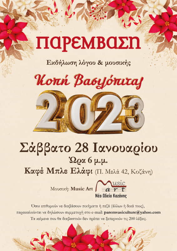 Το Περιοδικό Παρέμβαση διοργανώνει το Σάββατο 28 Ιανουαρίου, ώρα 6 μ.μ., στο καφέ Μπλε Ελάφι (Π. Μελά 42, Κοζάνη), εκδήλωση για το νέο έτος, στο πλαίσιο της οποίας, όσοι το επιθυμούν, μπορούν να διαβάσουν ποιήματα ή κείμενα της επιλογής τους. Παράλληλα, η Παρέμβαση θα κόψει την Βασιλόπιτα του 2023. Στο μουσικό μέρος της βραδιάς θα είναι η Music Art.