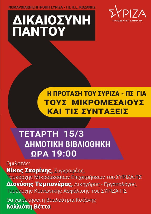 Η Νομαρχιακή Επιτροπή Κοζάνης ΣΥΡΙΖΑ-ΠΣ διοργανώνει ανοιχτή εκδήλωση και προσκαλεί τους πολίτες της Κοζάνης να συμμετάσχουν στη συζήτηση με θέμα την πρόταση του ΣΥΡΙΖΑ-ΠΣ για τους Μικρομεσαίους και τις Συντάξεις.