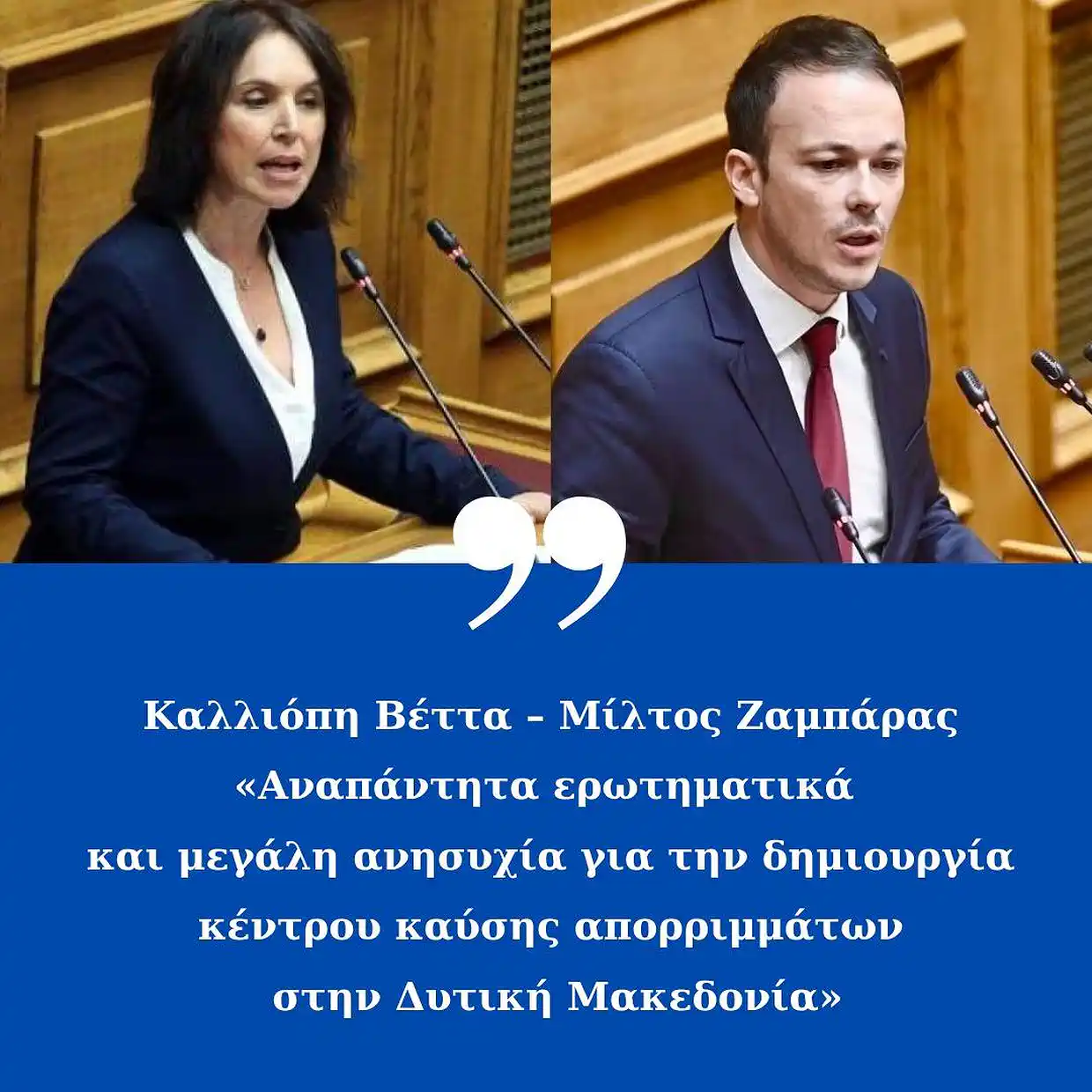 Η Βουλευτής Π.Ε. Κοζάνης και Τομεάρχης Τουρισμού ΣΥΡΙΖΑ Π.Σ. κ. Καλλιόπη Βέττα και ο Βουλευτής Π.Ε. Αιτωλοακαρνανίας και Τομεάρχης Περιβάλλοντος και Ενέργειας κ. Μίλτος Ζαμπάρας κατέθεσαν κοινοβουλευτική ερώτηση προς τον Υπουργό Περιβάλλοντος και Ενέργειας με θέμα: «Υπάρχει σχεδιασμός για δημιουργία Περιφερειακού Κέντρου καύσης απορριμμάτων στην Δυτική Μακεδονία;»