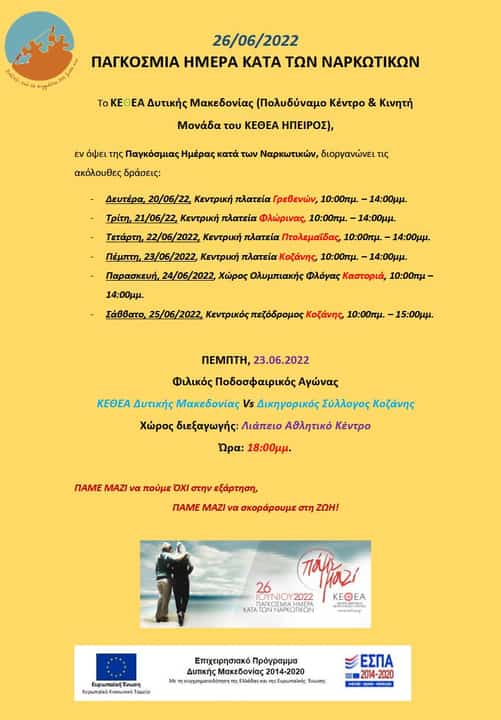 Το Κέντρο Θεραπείας Εξαρτημένων Ατόμων (ΚΕΘΕΑ) Δυτικής Μακεδονίας εν όψει της Παγκόσμιας Ημέρας κατά των Ναρκωτικών διοργανώνει ακόλουθες δράσεις με ενημερωτικά περίπτερα σε κεντρικά σημεία της Κοζάνης, Πτολεμαΐδας, Φλώρινας, Καστοριάς και Γρεβενών: