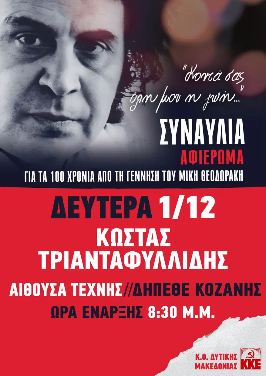 Η Κομματική Οργάνωση Δυτικής Μακεδονίας του ΚΚΕ  διοργανώνει μεγάλη συναυλία τη Δευτέρα 1 Δεκέμβρη, στις 8.30 μ.μ. στην Αίθουσα Τέχνης του ΔΗΠΕΘΕ Κοζάνης, αφιερωμένη στα 100 χρόνια από τη γέννηση του σπουδαίου συνθέτη Μίκη Θεοδωράκη με τίτλο «Κοντά σας όλη μου η ζωή».