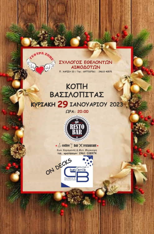 Την Κυριακή 29-1-23 και ώρα 20:00 ο σύλλογος των αιμοδοτών θα κόψει την Βασιλόπιτα στο “the RESTO BAR”. Καλούνται οι αιμοδότες, μέλη και φίλοι του συλλόγου να διασκεδάσουν παρέα με τον d.j. George Batianis. Θα υπάρχει Λαχειοφόρος αγορά με πολλά δώρα.