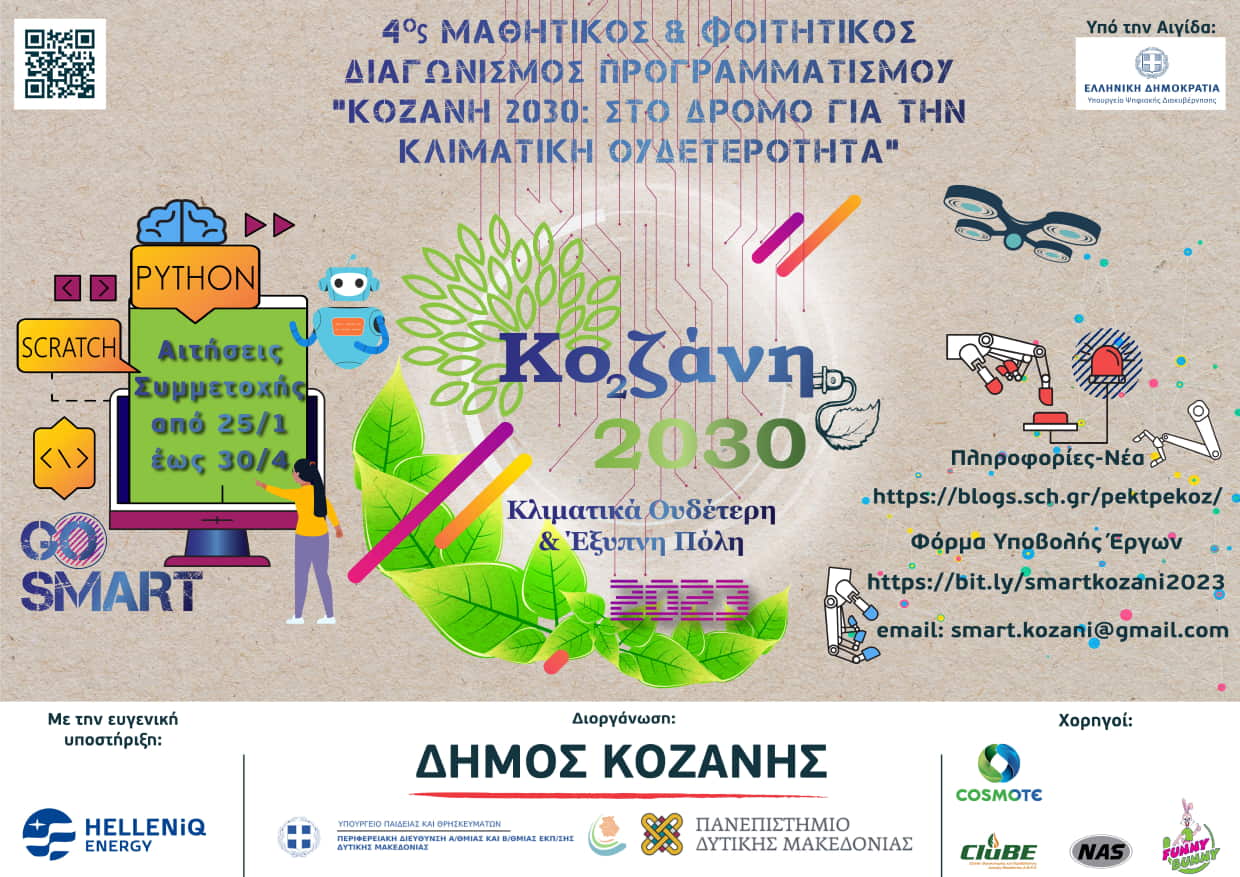 Η Περιφερειακή Διεύθυνση Εκπαίδευσης Δυτικής Μακεδονίας, ο Δήμος Κοζάνης και το Τμήμα Ηλεκτρολόγων Μηχανικών & Μηχανικών Υπολογιστών του Πανεπιστημίου Δυτικής Μακεδονίας διοργανώνουν τον Μαθητικό και Φοιτητικό Διαγωνισμό Προγραμματισμού με θέμα «Κοζάνη 2030: Στο δρόμο για την κλιματική ουδετερότητα», υπό την αιγίδα του Υπουργείου Ψηφιακής Διακυβέρνησης.