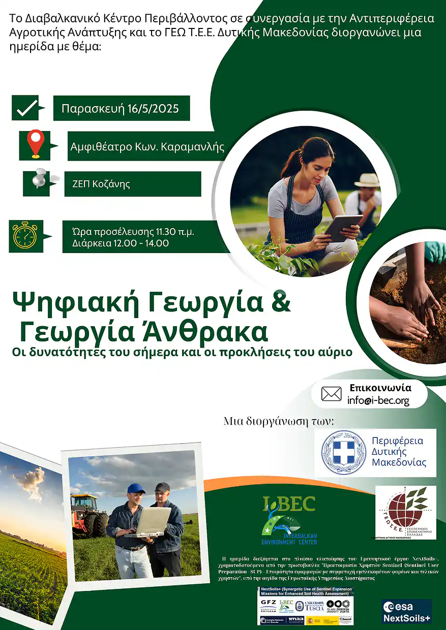 Το Διαβαλκανικό Κέντρο Περιβάλλοντος σε συνεργασία με την Αντιπεριφέρεια Αγροτικής Ανάπτυξης και το ΓΕΩΤ.Ε.Ε. Δυτικής Μακεδονίας  διοργανώνει ημερίδα  με θέμα: “Ψηφιακή Γεωργία & Γεωργία Άνθρακα“, που θα πραγματοποιηθεί την Παρασκευή 16 Μαΐου 2025, και ώρα 12:00 – 14:00 μ.μ., στο αμφιθέατρο “Κωνσταντίνος Καραμανλής”, στο ισόγειο του κτιρίου στη ΖΕΠ Κοζάνης.
