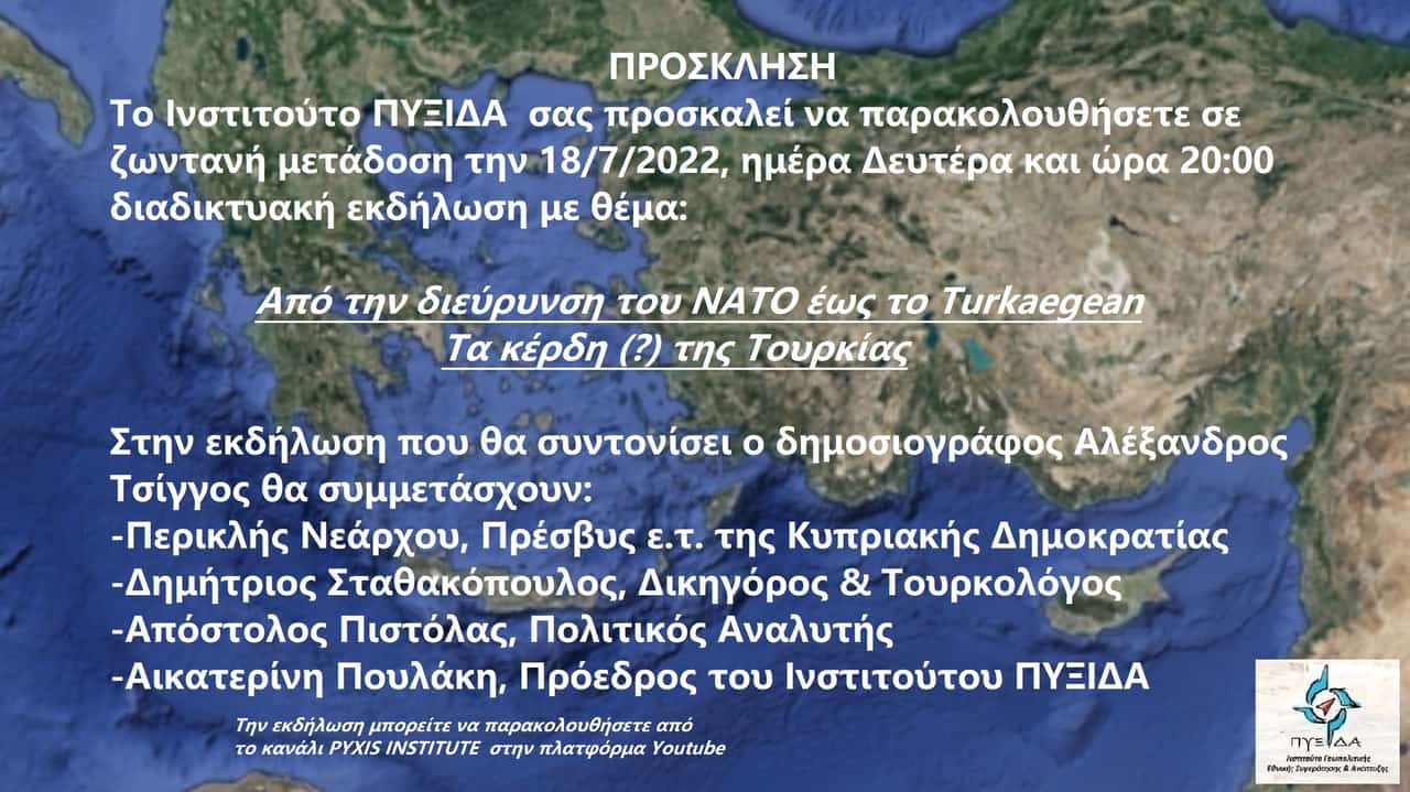 Το Ινστιτούτο Γεωπολιτικής, Εθνικής Ανασυγκρότησης και Ανάπτυξης ΠΥΞΙΔΑ, έχοντας πάντα ως πρόταγμα τα εθνικά θέματα και ιδίως τις απειλές που η χώρα μας δέχεται εξ ανατολών αλλά και εν όψει περαιτέρω εκδήλωσης επιθετικότητας  από την Τουρκία τόσο προς την Ελλάδα όσο και προς την Κύπρο, διοργανώνει  σε ζωντανή μετάδοση την 18/7/2022, ημέρα Δευτέρα και ώρα 20:00 διαδικτυακή εκδήλωση με θέμα: