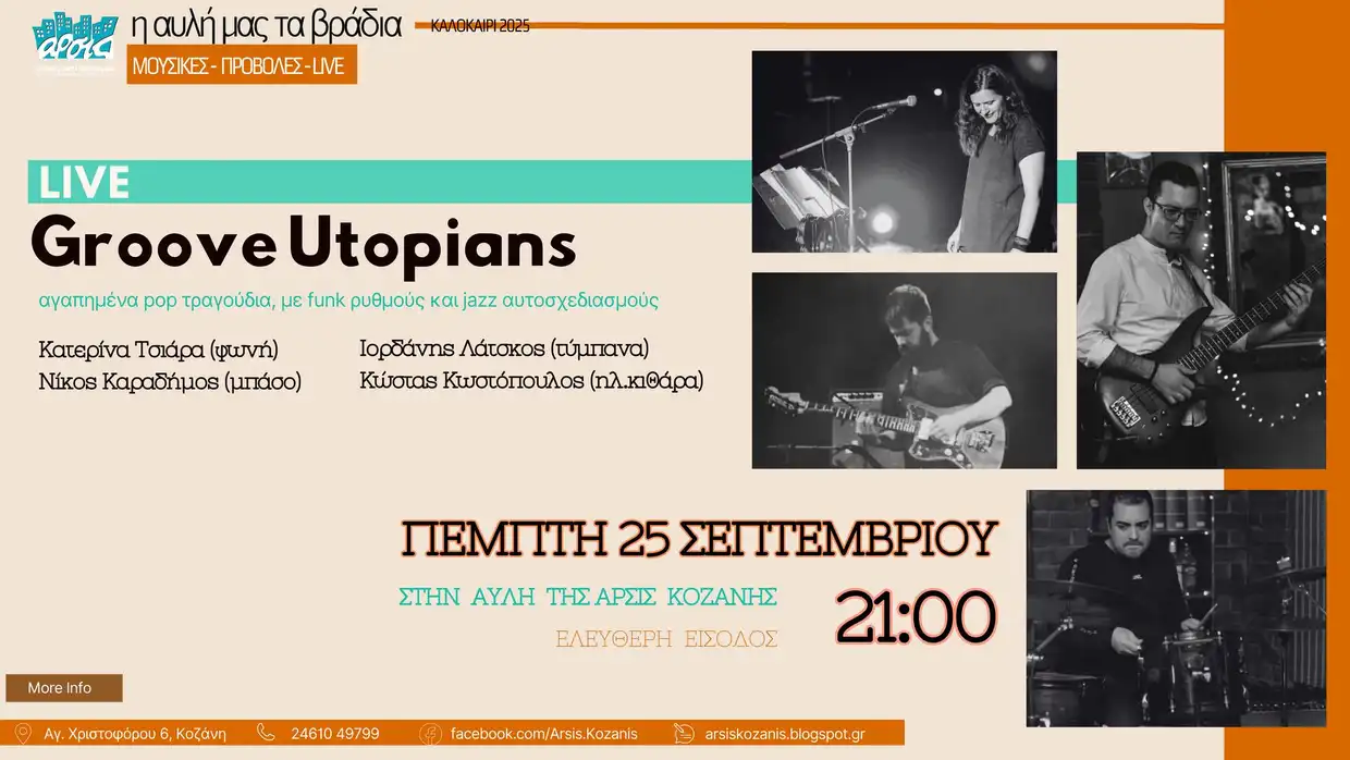 Η ΑΡΣΙΣ Κοζάνης, σας προσκαλεί σε μια μοναδική μουσική εμπειρία την Πέμπτη, στις 21:00, 25 Σεπτεμβρίου, στην αυλή του σπιτιού της με τους Groove Utopians!