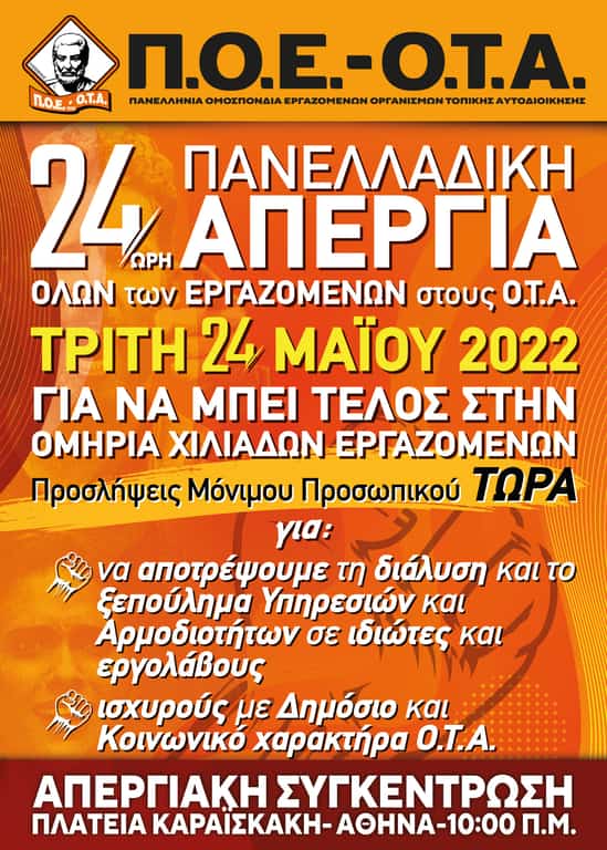 Η Πανελλήνια Ομοσπονδία Εργαζομένων Οργανισμών Τοπικής Αυτοδιοίκησης (Π.Ο.Ε.-Ο.Τ.Α.) αποφάσισε για αύριο, ΤΡΙΤΗ 24 ΜΑΪΟΥ 2022, την πραγματοποίηση 24ΩΡΗΣ ΠΑΝΕΛΛΑΔΙΚΗΣ ΑΠΕΡΓΙΑΣ και καλεί όλους τους εργαζόμενους στους Ο.Τ.Α. να λάβουν μέρος στην Απεργιακή Συγκέντρωση που θα γίνει στις 10:00 το πρωί, έξω από τα Γραφεία της Ομοσπονδίας (Καρόλου 24-Αθήνα), όπως επίσης και στις Πορείες Διαμαρτυρίας που θα ακολουθήσουν αφενός προς το Υπουργείο Εσωτερικών και αφετέρου προς τα γραφεία της Κεντρικής Ένωσης Δήμων Ελλάδας (Κ.Ε.Δ.Ε.).