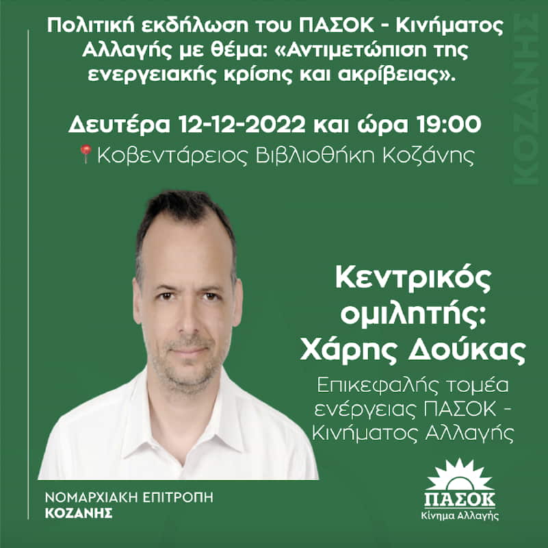 Η Νομαρχιακή Επιτροπή ΠΑΣΟΚ – Κινήματος Αλλαγής Κοζάνης προσκαλεί όλους τους φίλους και τα μέλη της Παράταξης στην πολιτική εκδήλωση που θα πραγματοποιηθεί την Δευτέρα 12-12 και ώρα 19:00 στην Κοβεντάρειο Βιβλιοθήκη Κοζάνης με θέμα «Αντιμετώπιση της ενεργειακής κρίσης και ακρίβειας».