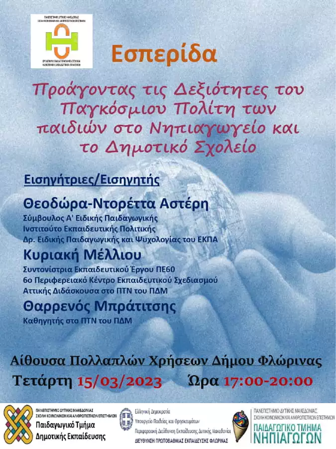 Το Εργαστήριο Παιδαγωγικών Μελετών και Καινοτόμων Εκπαιδευτικών Πρακτικών της Σχολής Κοινωνικών και Ανθρωπιστικών Επιστημών του Πανεπιστημίου Δυτικής Μακεδονίας, σε συνεργασία με το Παιδαγωγικό Τμήμα Δημοτικής Εκπαίδευσης, το Παιδαγωγικό Τμήμα Νηπιαγωγών του Π.Δ.Μ. και τη Διεύθυνση Πρωτοβάθμιας Εκπαίδευσης Φλώρινας, θα πραγματοποιήσουν εσπερίδα με θέμα: