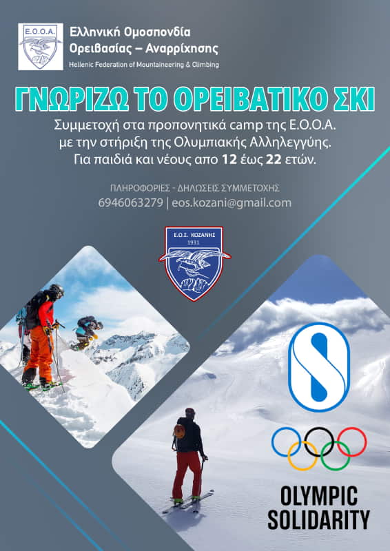 Ο Ελληνικός Ορειβατικός Σύνδεσμος (Ε.Ο.Σ.) Κοζάνης, σε συνεργασία με την Ελληνική Ομοσπονδία Ορειβασίας – Αναρρίχησης (Ε.Ο.Ο.Α.) και με την στήριξη της Ολυμπιακής Αλληλεγγύης της Ελληνικής Ολυμπιακής Επιτροπής, προσκαλεί παιδιά και νέους από 12 έως 22 ετών, με επαρκείς γνώσεις χιονοδρομίας (κατάβαση κόκκινης πίστας – παράλληλες στροφές), να γνωρίσουν το ολυμπιακό αγώνισμα του Ορειβατικού Σκι, συμμετέχοντας στα προπονητικά camp διάρκειας δύο ετών (2022-2023 & 2023-2024), υπο την καθοδήγηση πιστοποιημένων προπονητών της Γενικής Γραμματείας Αθλητισμού (Γ.Γ.Α.).