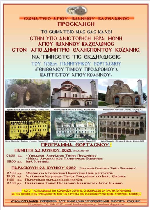 Πρόσκληση Πανηγυρικού Εορτασμού του «Γενέσιου Τιμίου Προδρόμου Προφήτου και Βαπτιστού του Χριστού Αγίου Ιωάννου Βαζελώνος»