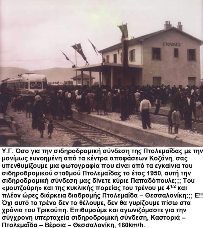 Υ.Γ. Όσο για την σιδηροδρομική σύνδεση της Πτολεμαΐδας με την μονίμως ευνοημένη από τα κέντρα αποφάσεων Κοζάνη, σας υπενθυμίζουμε μια φωτογραφία που είναι από τα εγκαίνια του σιδηροδρομικού σταθμού Πτολεμαΐδας το έτος 1950, αυτή την σιδηροδρομική σύνδεση μας δίνετε κύριε Παπαδόπουλε;;; Του «μουτζούρη» και της κυκλικής πορείας του τρένου με 41/2 και πλέον ώρες διάρκεια διαδρομής Πτολεμαΐδα – Θεσσαλονίκης;;;; Ε!!! Όχι αυτό το τρένο δεν το θέλουμε, δεν θα γυρίζουμε πίσω στα χρόνια του Τρικούπη. Επιθυμούμε και αγωνιζόμαστε για την σύγχρονη υπερταχεία σιδηροδρομική σύνδεση, Καστοριά – Πτολεμαΐδα – Βέροια – Θεσσαλονίκη, 160km/h.