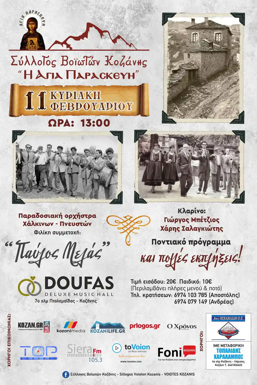 Ο Σύλλογος Βοϊωτών Κοζάνης «Η Αγία Παρασκευή» διοργανώνει τον Ετήσιο Χορό του Συλλόγου, την Κυριακή 11 Φεβρουαρίου και ώρα 13:00 (μεσημέρι), στην Αίθουσα Εδηλώσεων «DOUFAS DELUXE MUSIC HALL» (7ο χλμ Κοζάνης-Πτολεμαΐδας).
