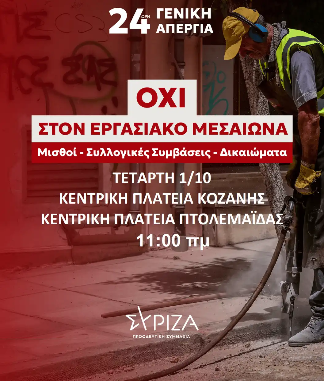 ΣΥΡΙΖΑ Κοζάνης: Συμμετέχουμε στην πανελλαδική απεργία της 1ης Οκτωβρίου διεκδικώντας