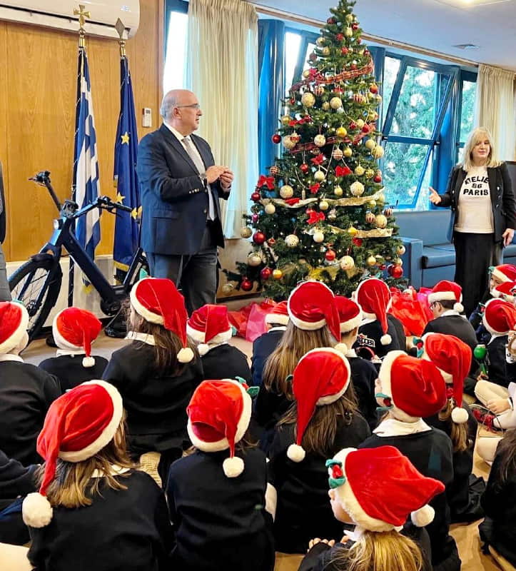Γιορτινή ατμόσφαιρα δημιούργησαν σήμερα, Παρασκευή 23 Δεκεμβρίου 2022, στο Υπουργείο Υποδομών και Μεταφορών, μαθητές της Β΄ Δημοτικού από τα Αρσάκεια Εκπαιδευτήρια Ψυχικού, που έψαλλαν τα Κάλαντα των Χριστουγέννων στον Υφυπουργό Υποδομών και Μεταφορών, αρμόδιο για τις Μεταφορές κ. Μιχάλη Παπαδόπουλο και στον Γενικό Γραμματέα Μεταφορών κ. Γιάννη Ξιφαρά.