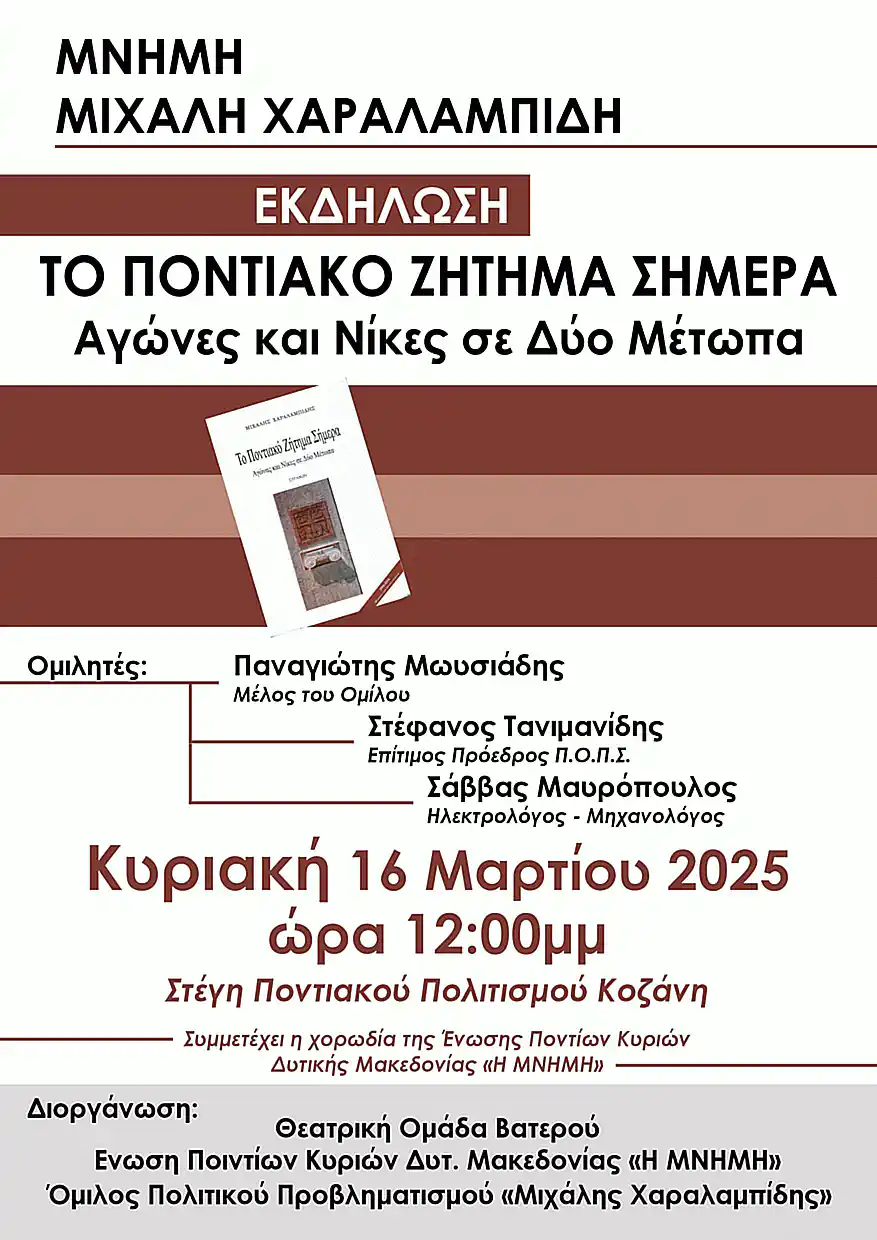 Σας προσκαλούμε να μας τιμήσετε με την παρουσία σας στην εκδήλωση που διοργανώνουμε την Κυριακή 16 Μαρτίου 2025 και ώρα 12:00 στην Στέγη Ποντιακού Πολιτισμού Κοζάνης.