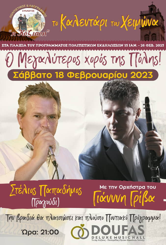 Το Σάββατο της Μικρής Αποκριάς  18 Φεβρουαρίου 2023, στο οικογενειακό κέντρο “DOUFAS DE LUXE MUSIC HALL” που βρίσκεται στο 7ο χιλιόμετρο της  εθνικής οδού Κοζάνης – Πτολεμαΐδας(πρώην Μακεδονία Παλλάς), θα γίνει ο ετήσιος χορός του Πολιτιστικού – Λαογραφικού Συλλόγου Κοζάνης και Φανού «Η Κόζιανη».
