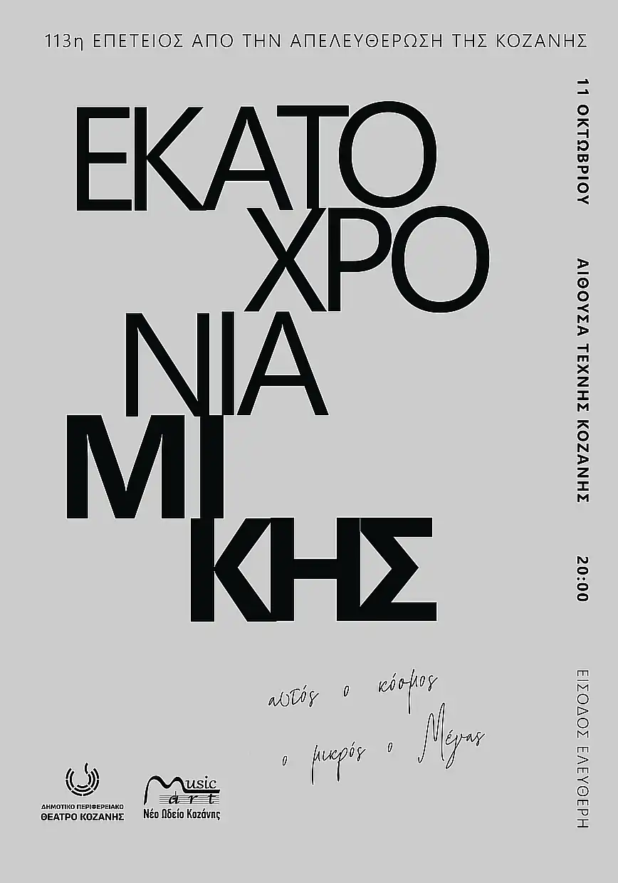 Το Δημοτικό Περιφερειακό Θέατρο Κοζάνης, στο πλαίσιο των δράσεων του open call, συνδιοργανώνει με το Νέο Ωδείο Κοζάνης – Musicart αφιέρωμα για τα 100 χρόνια από τη γέννηση του σπουδαίου συνθέτη Μίκη Θεοδωράκη με μία συναυλία αφιερωμένη στο πολυσχιδές έργο του. Το έργο αυτό ξεπερνά τα σύνορα της μουσικής δημιουργίας και γίνεται το ίδιο πολιτισμός, ιστορία και συλλογική μνήμη.