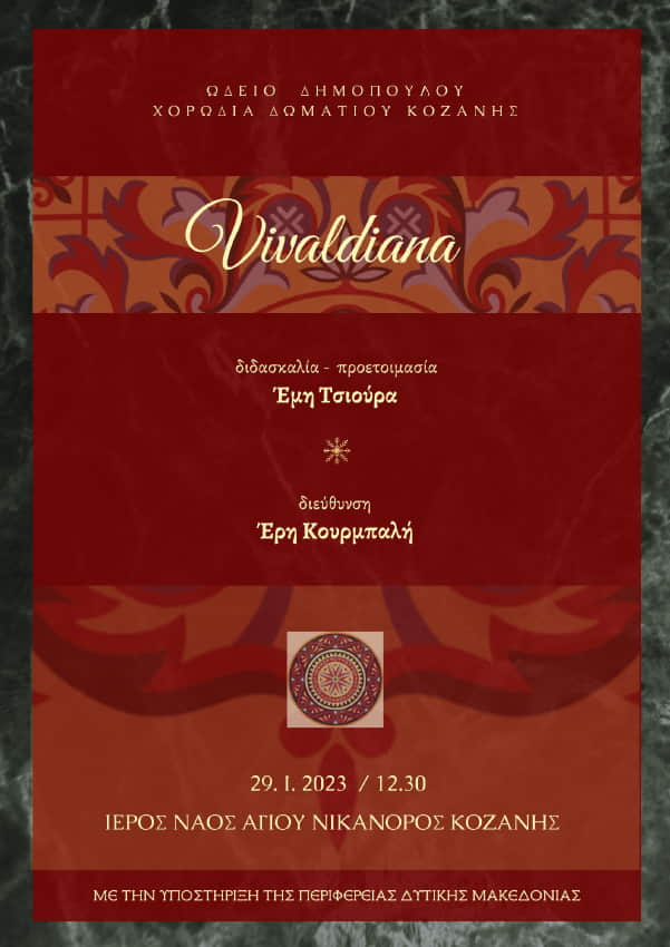 Το Ωδείο Δημόπουλου και η Χορωδία Δωματίου Κοζάνης, με την πολύτιμη υποστήριξη της Περιφέρειας Δυτικής Μακεδονίας παρουσιάζουν ένα αφιέρωμα στο έργο του συνθέτη Antonio Vivaldi.