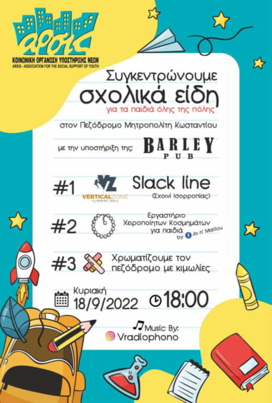 Σας περιμένουμε την Κυριακή 18 Σεπτεμβρίου, 18:00-21:00, στον πεζόδρομο Μητροπολίτη Κωνσταντίου (Μητρόπολη Κοζάνης), μπροστά και μαζί με το «The Barley Pub», σε μια ημέρα δράσης και συγκέντρωσης σχολικών ειδών.