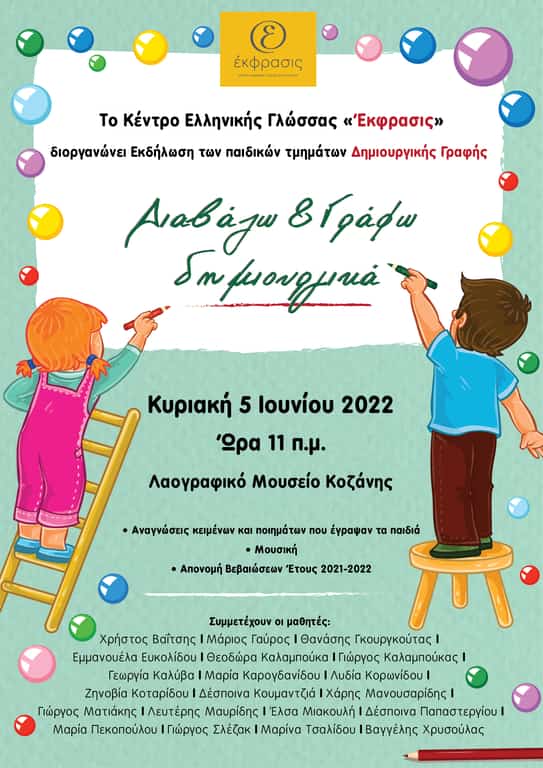 Το Κέντρο Ελληνικής Γλώσσας «Έκφρασις» διοργανώνει Εκδήλωση των παιδικών τμημάτων Δημιουργικής Γραφής, την Κυριακή 5 Ιουνίου, ώρα 11 π.μ., στο Λαογραφικό Μουσείο Κοζάνης.