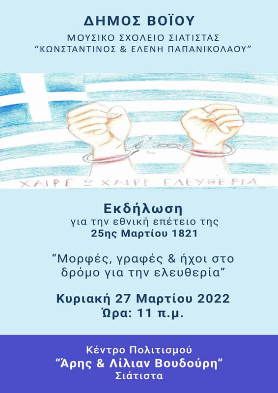 Ο Δήμος Βοΐου  και το Μουσικό Σχολείο Σιάτιστας «Κωνσταντίνος & Ελένη  Παπανικολάου»   διοργανώνουν εορταστική εκδήλωση για την εθνική επέτειο της 25ης Μαρτίου 1821, την Κυριακή  27 Μαρτίου 2022 και ώρα 11.00 πμ στο Πολιτιστικό Κέντρο « Άρης & Λίλιαν Βουδούρη» στη Σιάτιστα, με θέμα:  « Μορφές, γραφές και ήχοι στο δρόμο  για την ελευθερία…».