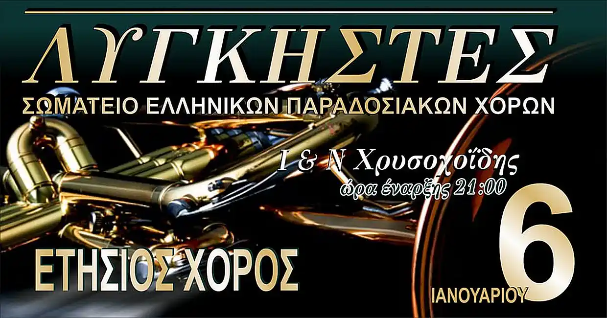 Το Σωματείο Ελληνικών Παραδοσιακών Χορών "ΛΥΓΚΗΣΤΕΣ" ανακοινώνει την πραγματοποίηση του ετήσιου χορού του, ο οποίος θα πραγματοποιηθεί την 6η Ιανουαρίου 2025, στο υπέροχο κέντρο Ι.Ν. Χρυσοχοΐδης.