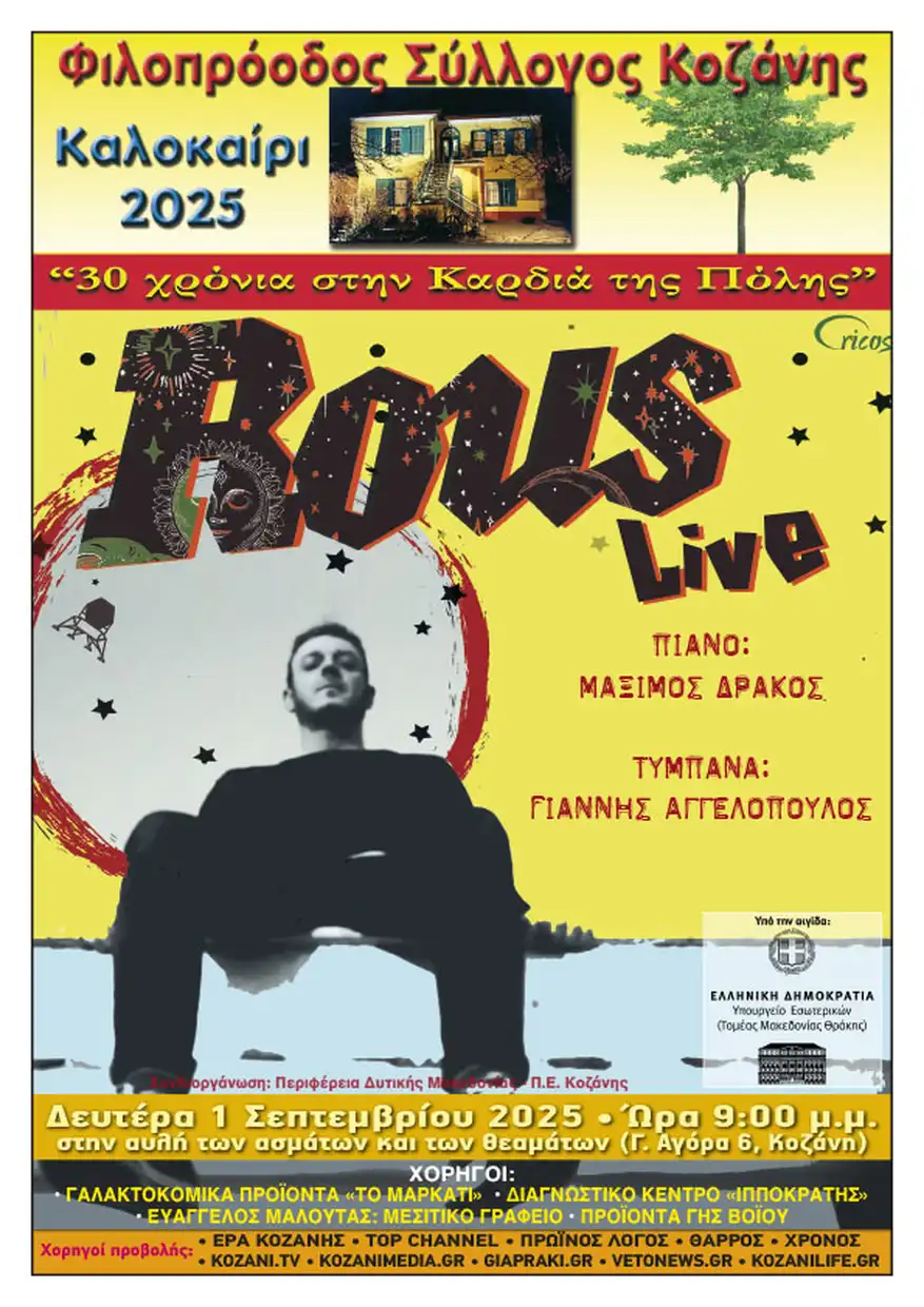 Ο Φιλοπρόοδος Σύλλογος Κοζάνης, μετά την Αυγουστιάτικη μικρή ανάπαυλα, επανέρχεται στη φιλόξενη αυλή, για τον δεύτερο κύκλο των μουσικών εκδηλώσεων του φετινού καλοκαιριού και σας προσκαλεί σε μια μοναδική μουσική παράσταση με τον πολυτάλαντο και πολύ ρομαντικό Γιώργο Ρους.