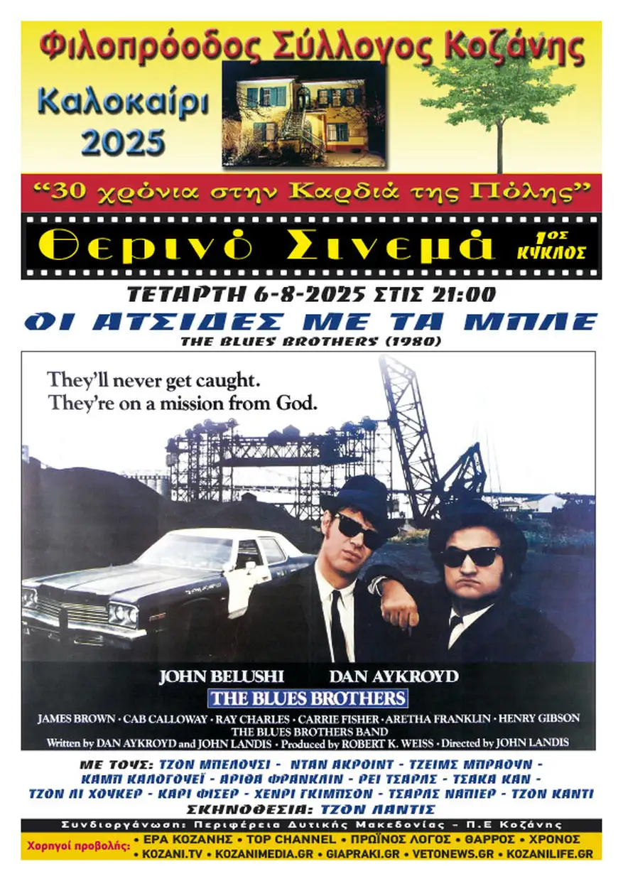 Ο Φιλοπρόοδος Σύλλογος παρουσιάζει, αυτή την Τετάρτη 6 Αυγούστου 2025, την τρελή μουσική κωμωδία καταστροφής «Οι Ατσίδες με τα Μπλε» (The Blues Brothers- 1980), σε σκηνοθεσία του Τζον Λάντις. Πρωταγωνιστούν οι Τζον Μπελούσι,  Νταν Ακρόιντ, Κάρι Φίσερ, Χένρι Γκίμπσον, Τσαρλς Νάπιερ και Τζον Κάντι.