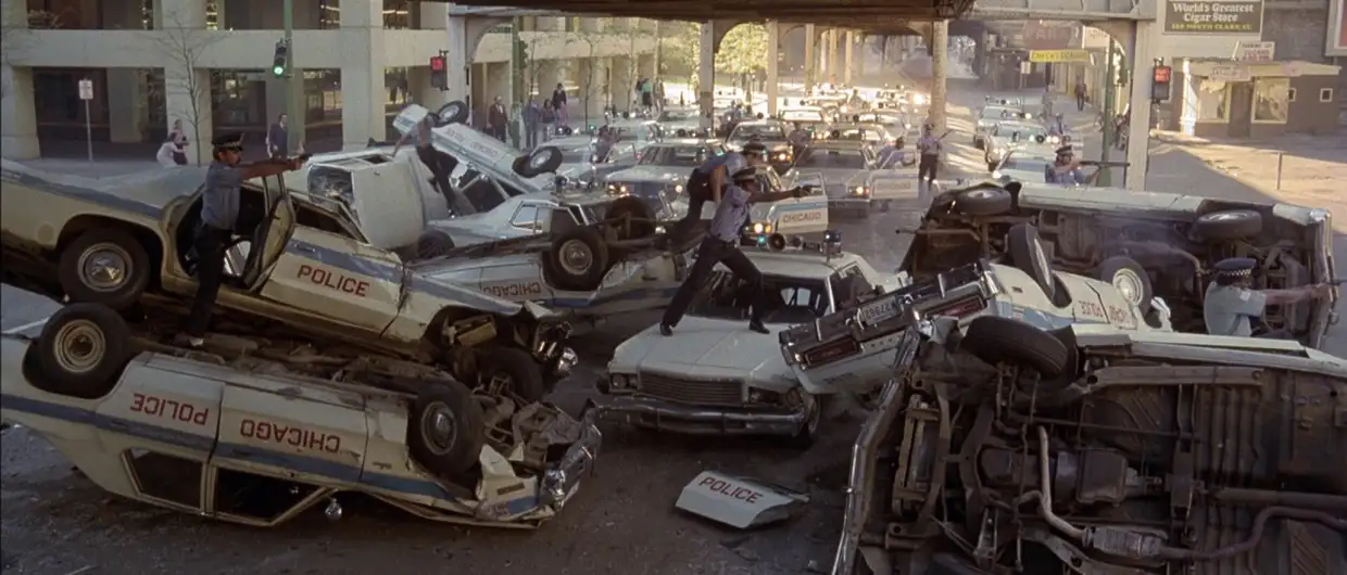 «Μέρος του αστείου του «The Blues Brothers» ήταν το μέγεθος της καταστροφής», είπε ο Λάντις σε συνέντευξη του και πρόσθεσε: «Η σημασία των Blues Brothers φαίνεται στο τέλος όταν στο Daley Plaza, οι μάζες του νόμου συγκεντρώνονται. Αυτή η τεράστια δύναμη αστυνομική και στρατιωτική για να σταματήσουν δύο ανθρώπους σε ένα ασανσέρ, οι οποίοι θέλουν να πληρώσουν ένα χρέος». Ο Λάντις αναφερόταν στο τέλος της ταινίας όταν ένα κυνήγι αυτοκινήτων 170 χλμ τελειώνει στο κέντρο του Σικάγο. Η πόλη του Σικάγο και η πολιτεία του Ιλινόις συγκεντρώνουν όλες τις δυνάμεις τους για να σταματήσουν τον Τζέικ και τον Έλγουντ Μπλουζ να διαφύγουν από την επιτυχημένη συναυλία όπου συγκέντρωσαν τα χρήματα που χρειάζονταν για να σώσουν το ορφανοτροφείο.
