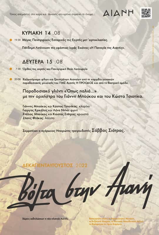 Η Κοινότητα και οι φορείς της Αιανής, Ιστορικής Έδρας του Δήμου Κοζάνης, σας προσκαλούν να τιμήσετε με την παρουσία σας τις λατρευτικές και πολιτιστικές εκδηλώσεις που θα τελεσθούν σύμφωνα με το ακόλουθο πρόγραμμα: