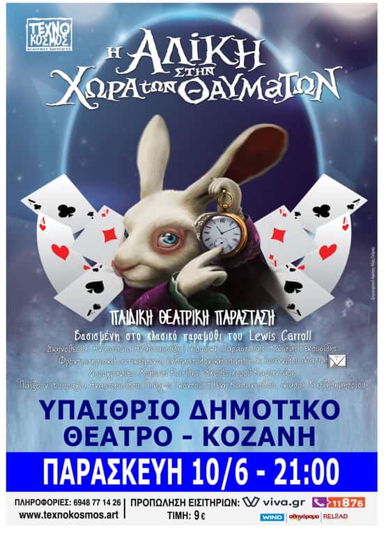Οι Θεατρικές παραγωγές Τεχνόκοσμος παρουσιάζουν την παιδική θεατρική παράσταση «Η Αλίκη στην χώρα των θαυμάτων», βασισμένη στο κλασικό παραμύθι του Lewis Carroll. Στο Δημοτικό Υπαίθριο Θέατρο Κοζάνης. Την Παρασκευή 10 Ιουνίου στις 21:00