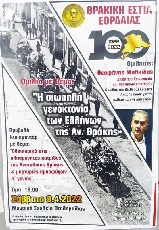 Εκδήλωση – ομιλία του πανεπιστημιακού Θεοφάνη Μαλκίδη και θέμα: «Η σιωπηλή γενοκτονία των Ελλήνων της Αν. Θράκης (1912-1922)», το  Σάββατο 9 Απριλίου 2022 και ώρα 7 μ.μ. στο αμφιθέατρο του Μουσικού Σχολείου Πτολεμαΐδας.