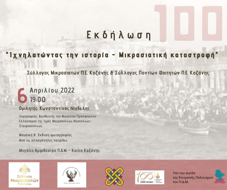 Ο Σύλλογος Μικρασιατών ΠΕ Κοζάνης & ο Σύλλογος Ποντίων Φοιτητών ΠΕ Κοζάνης, διοργανώνουν εκδήλωση με τίτλο “Ιχνηλατώντας την ιστορία – Μικρασιατική καταστροφή“, την Τετάρτη 6 Απριλίου, στο μεγάλο Αμφιθέατρο του Πανεπιστήμιο Δυτικής Μακεδονίας (Κοίλα Κοζάνης), στις 7 το απόγευμα.