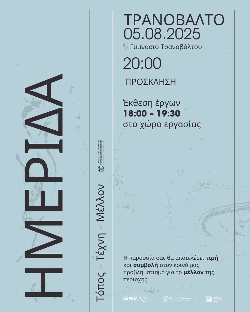 Ο Δήμος Σερβίων σας προσκαλεί στην ημερίδα με τίτλο «Τόπος – Τέχνη – Μέλλον» που θα πραγματοποιηθεί στο Γυμνάσιο Τρανοβάλτου, την Τρίτη 5 Αυγούστου 2025, και ώρα 20:00.
