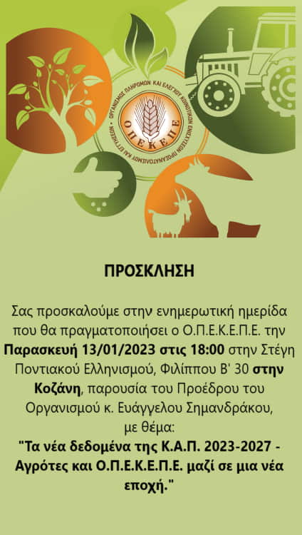 Την Παρασκευή 13/1/2023 στη Στέγη Ποντιακού Ελληνισμού, στις 18.00 ο ΟΠΕΚΕΠΕ θα πραγματοποιήσει ημερίδα ενημέρωσης, με θέμα “Τα νέα δεδομένα της Κ.Α.Π. 2023-2027 – Αγρότες και Ο.Π.Ε.Κ.Ε.Π.Ε. μαζί σε μια νέα εποχή”.