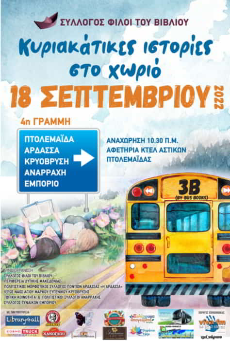 Ένα λεωφορείο 3B (By Bus Books) εφοδιασμένο με θεματικά λογοτεχνικά κουτιά θα ξεκινήσει από την πόλη της Πτολεμαΐδας, θα σταθμεύσει στα χωριά των γραμμών  και θα αλληλεπιδράσει με τις ιστορίες του χωριού.