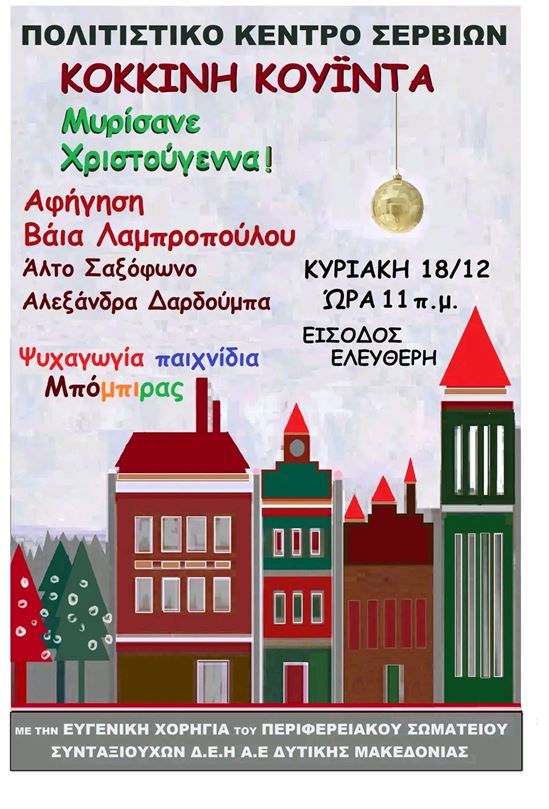 Την παιδική χριστουγεννιάτικη εκδήλωση διοργανώνει η Θεατρική Ομάδα των Σερβίων « ΚΟΚΚΙΝΗ ΚΟΥΪΝΤΑ» με την χορηγία του Περιφερειακού Σωματείου Συνταξιούχων ΔΕΗ Δυτικής Μακεδονίας.