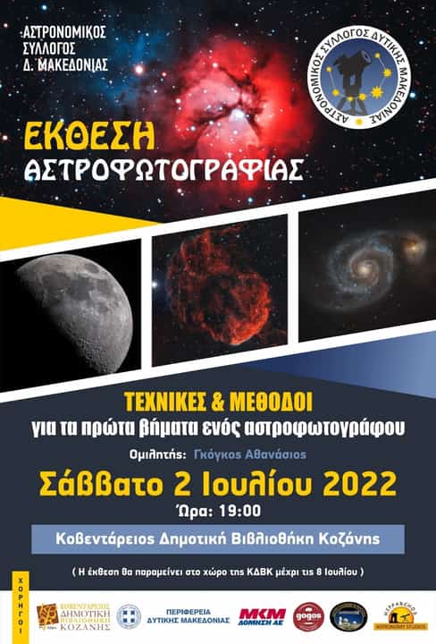 Ο Αστρονομικός Σύλλογος Δυτικής Μακεδονίας διοργανώνει το Σάββατο 2 Ιουλίου στις 19.00  Έκθεση Αστροφωτογραφίας στο χώρο της Κοβεντάρειου Δημοτικής Βιβλιοθήκης Κοζάνης.