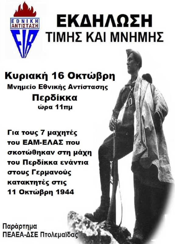 Το παράρτημα Πτολεμαΐδας της Πανελλήνιας Ένωσης Αγωνιστών Εθνικής Αντίστασης και Δ.Σ.Ε. προκαλεί τον λαό της περιοχής στην εκδήλωση τιμής και μνήμης που διοργανώνει στο χώρο του μνημείου Εθνικής Αντίστασης στον Περδίκκα, την Κυριακή 16 Οκτώβρη 2022 και ώρα 11πμ, ώστε να τιμήσουμε την θυσία των επτά αγωνιστών του ΕΑΜ-ΕΛΑΣ που έπεσαν για την λευτεριά και την ανεξαρτησία της παρτίδας.