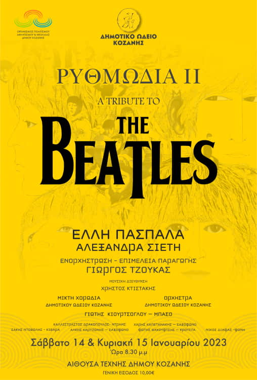 Πλέον στην μετά κορωνοιού εποχή, είμαστε και πάλι εδώ για ένα νέο tribute. Ένα αφιέρωμα σε ένα από τα μεγαλύτερα συγκροτήματα όλων των εποχών (για πολλούς το σπουδαιότερο) τους θρυλικούς BEATLES, σε ενορχήστρωση & επιμέλεια μουσικής του Διευθυντή του Δημοτικού Ωδείου Κοζάνης, Γιώργου Τζούκα.