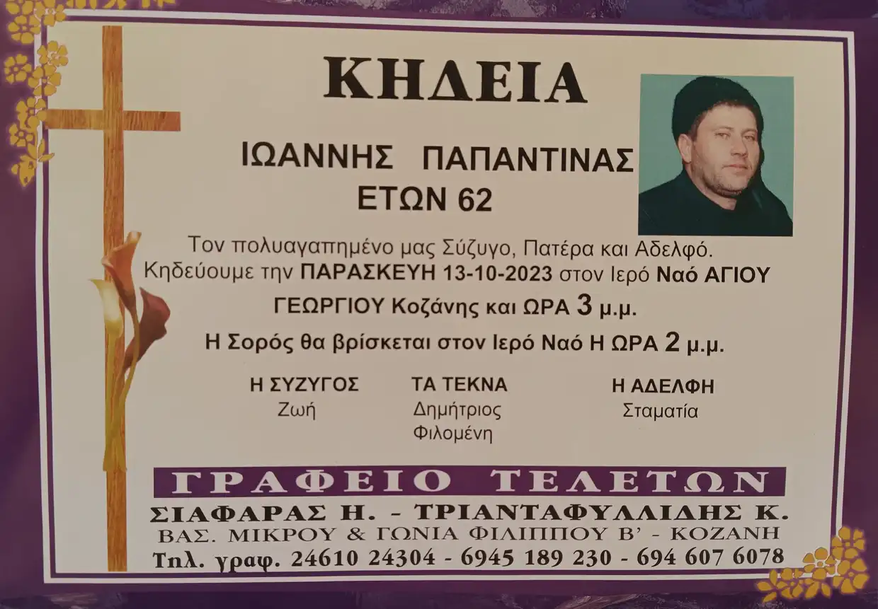 Έφυγε από τη ζωή, σκορπώντας τη θλίψη σε φίλους και συγγενείς, ο Ιωάννης Παπαντίνας, ετών 62.