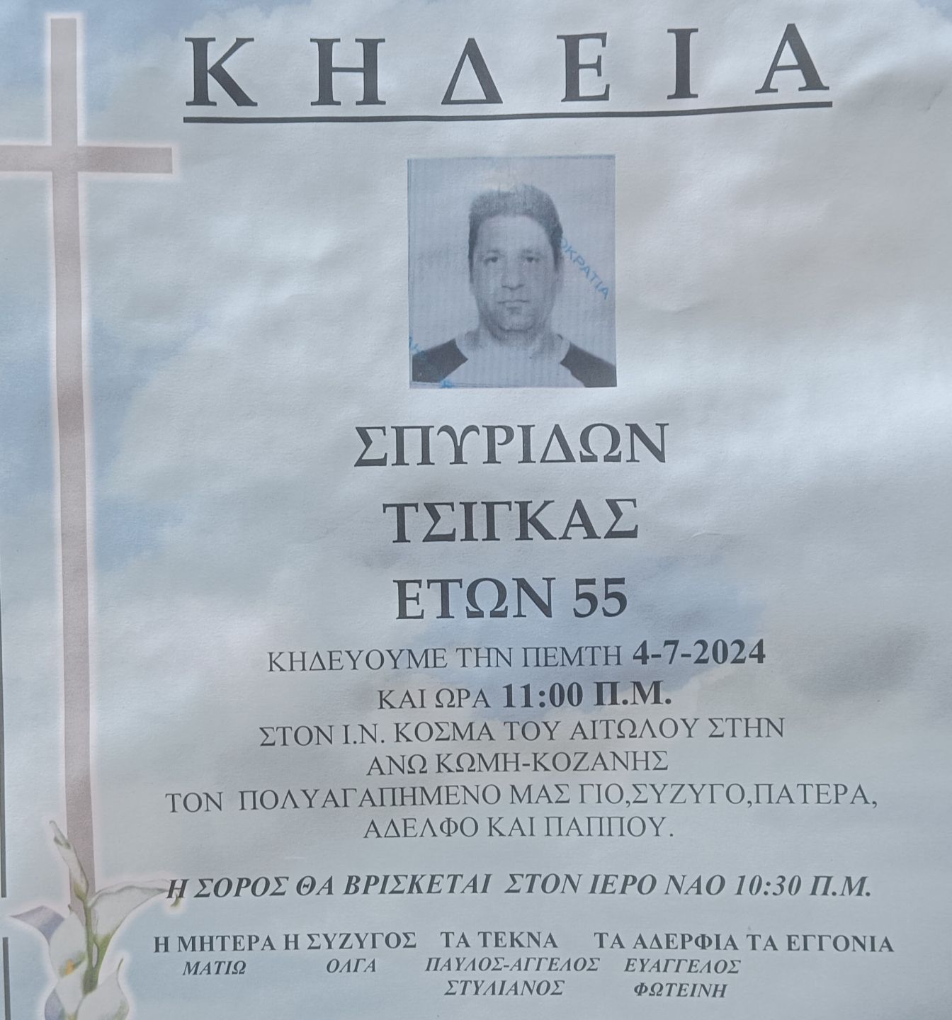 Σήμερα 4-7-2024 το τελευταίο αντίο και ώρα 11:00 π.μ. στον Ιερό Ναό Κοσμά του Αιτωλού στην Άνω Κώμη Κοζάνης