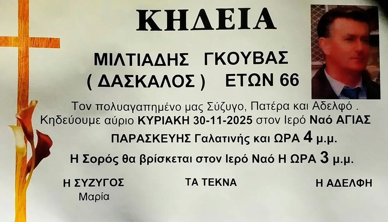 Σε ηλικία 66 ετών “έφυγε” από τη ζωή ο εκπαιδευτικός Μιλτιάδης Γκούβας από τη Γαλατινή Κοζάνης.