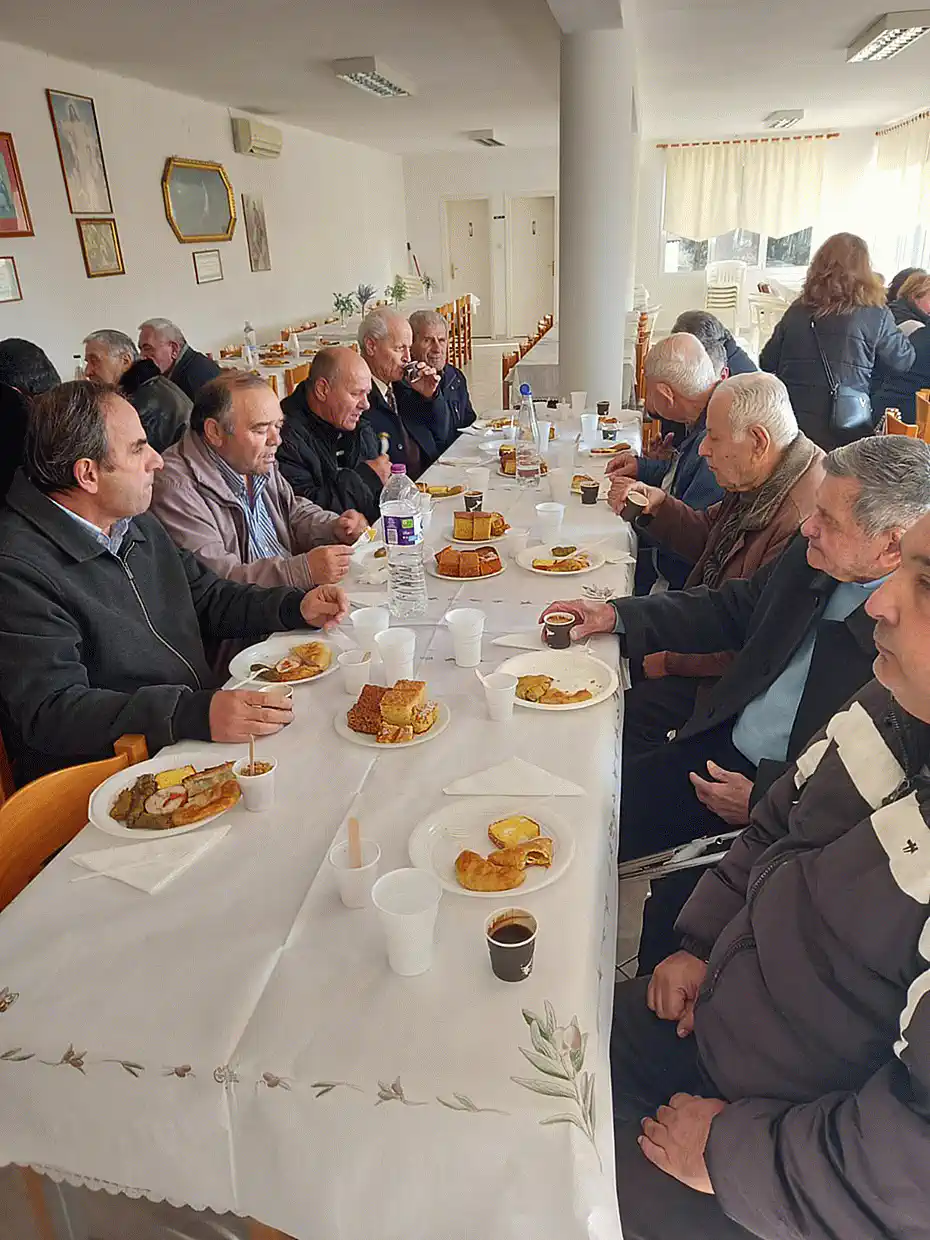 Καφέ με πλούσιο εορταστικό κέρασμα προσέφερε η Ενορία σε όλο το εκκλησίασμα στην περιποιημένη, γεμάτη φως, αίθουσά της, απέναντι από το έρημο πλέον από παιδιά, επιβλητικό ωστόσο στη θέα του, Δημοτικό Σχολείο, το οποίο έχτισαν, όπως μας είπαν οι παλιότεροι, χτίστες-μαστόροι από το Βελβεντό.