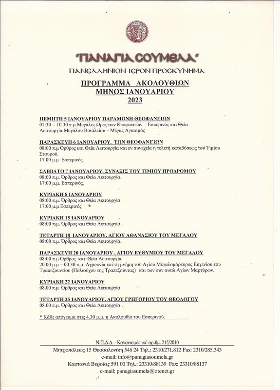 Παναγία Σουμελά Ακολουθίες Ιανουάριου 2023