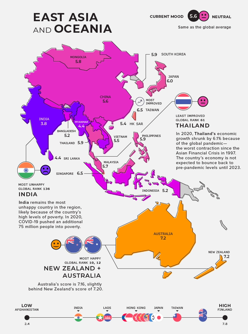 Από την άλλη πλευρά, η Ταϊλάνδη είναι αυτή που σημείωσε τη μικρότερη βελτίωση στους δείκτες ευτυχίας στην περιοχή, πιθανότατα λόγω του σημαντικού κόστους που είχε ο COVID-19 στην οικονομία της χώρας. Το 2020, η οικονομική ανάπτυξη συρρικνώθηκε κατά 6,1% στην Ταϊλάνδη—η χειρότερη συρρίκνωση της χώρας ύστερα από την ασιατική χρηματοπιστωτική κρίση του 1997. Η οικονομία της Ταϊλάνδης δεν αναμένεται να ανακάμψει στα προ πανδημίας επίπεδα πριν από το 2023.