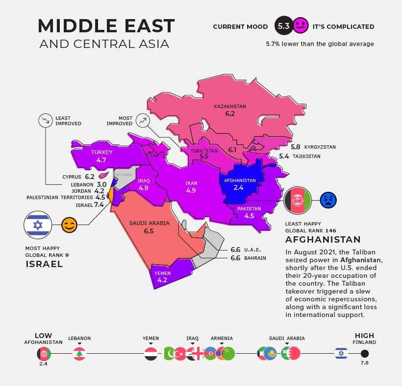 Στον αντίποδα βρίσκεται το Αφγανιστάν, που είναι όχι μόνο η λιγότερο ευτυχισμένη χώρα της περιοχής, αλλά και ολόκληρου του κόσμου. Χαρακτηριστικό είναι ότι ήταν ήδη το λιγότερο ευτυχισμένο έθνος και προτού οι Ταλιμπάν επανέλθουν στην εξουσία. Και οι υπεύθυνοι της έρευνας προειδοποιούν ότι η βαθμολογία της ευτυχίας του τα επόμενα χρόνια ενδέχεται να πέσει ακόμη περισσότερο από το 2,4 όπου βρίσκεται τώρα.